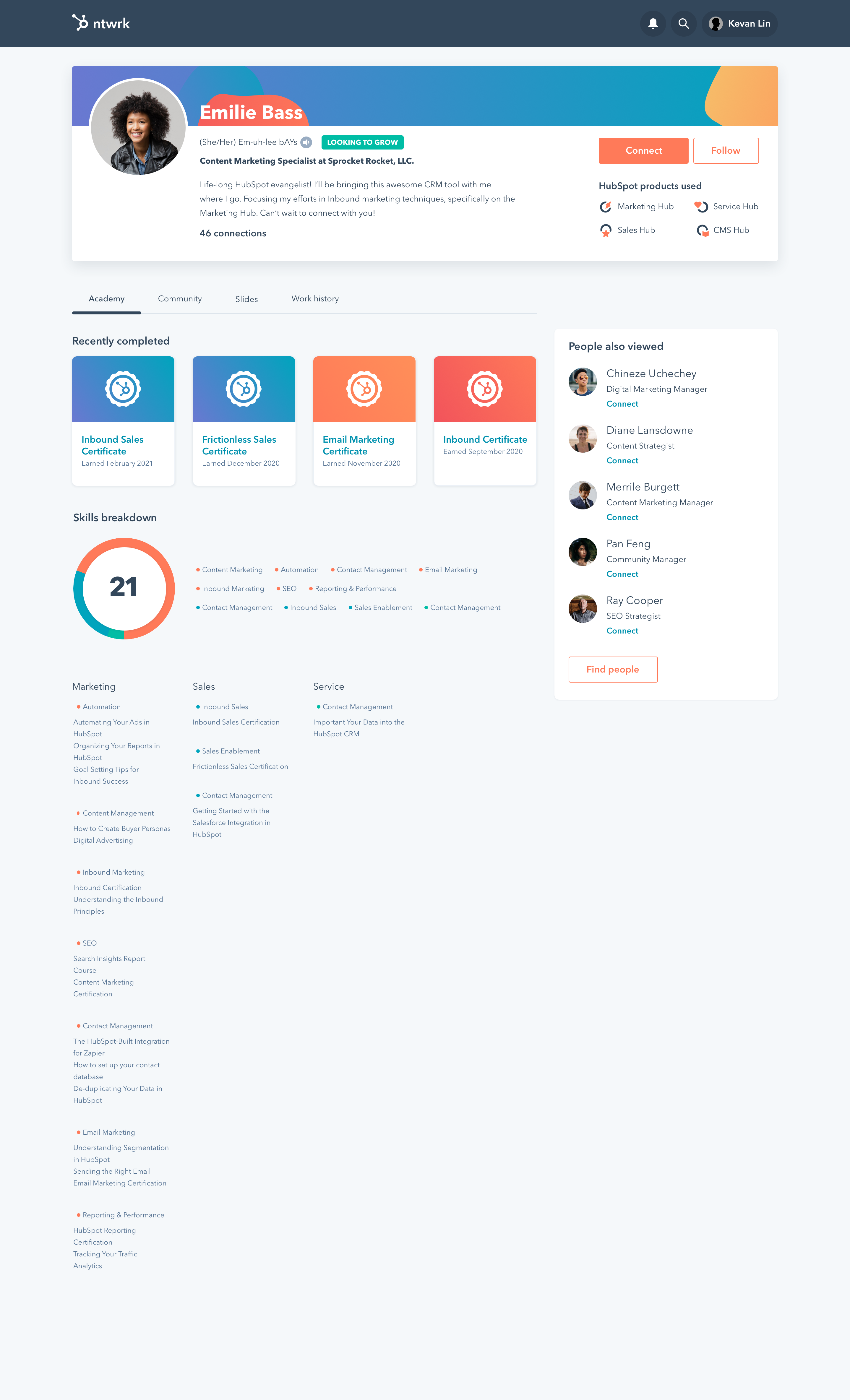 Validation of existing credentials is a big thing. When thinking about the manifestation of the profile page, how can HubSpot be extra attentive to these credentials certifications, badges, etc.) that our customers have earned. The need to connect to one another is highly rampant theme, but not specific enough in what kind of connection should be facilitated and to what end.