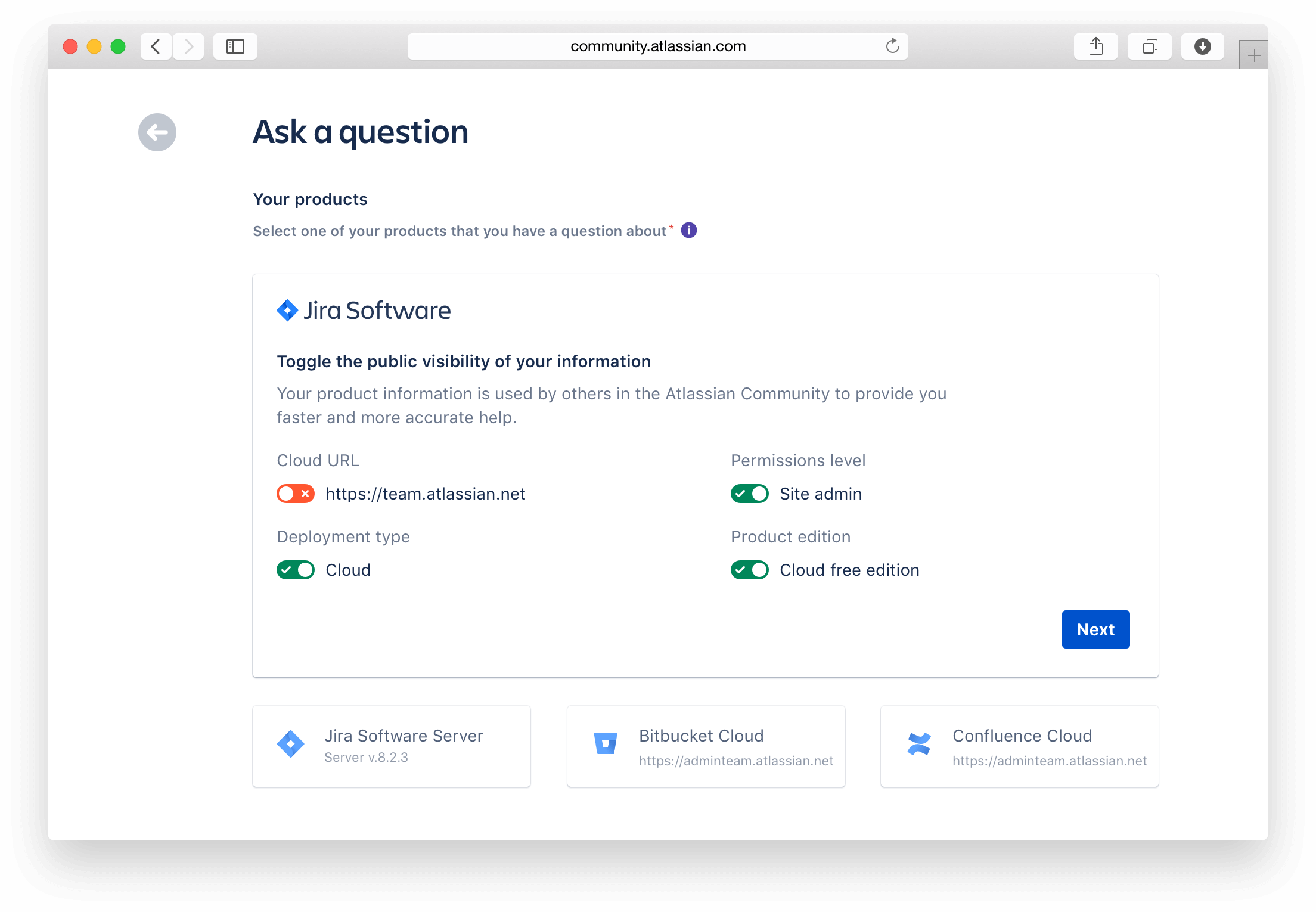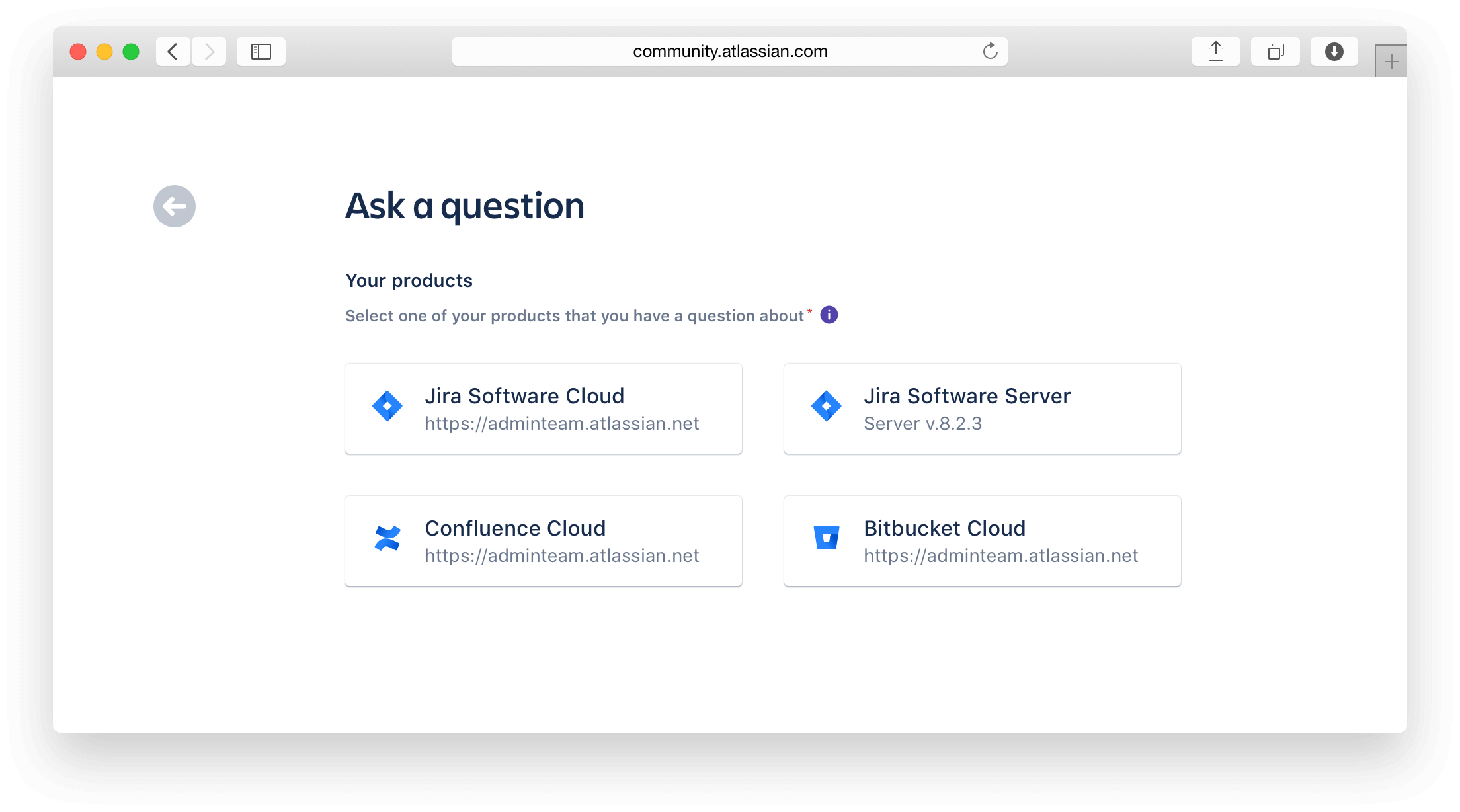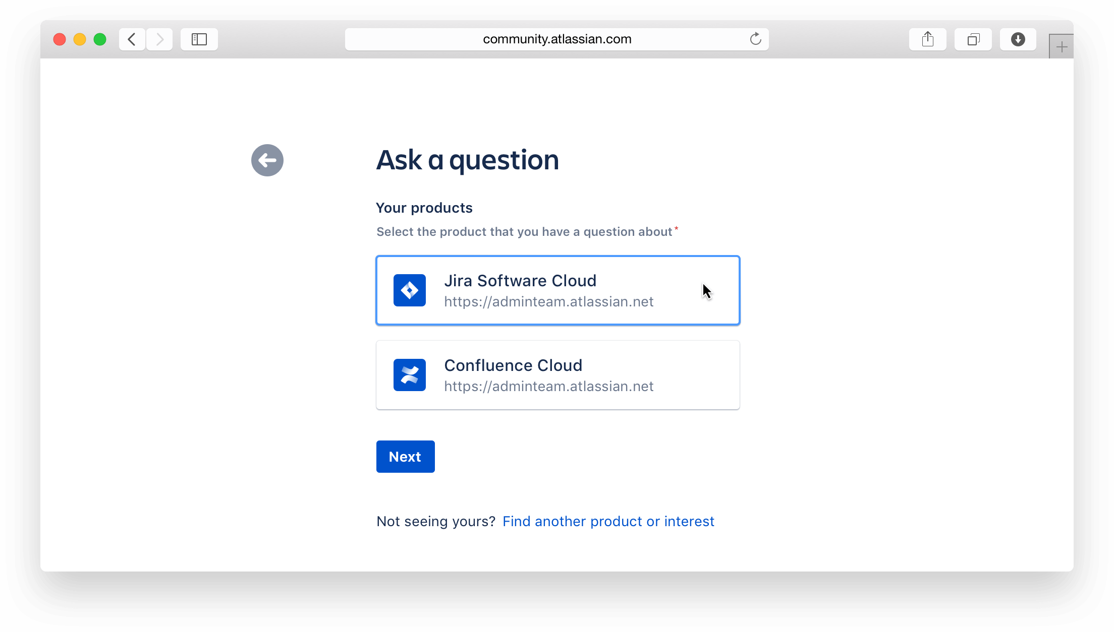 At this point, our hypothesis was, there's clearly something about the cloud url as a means of denoting locked or disabled by way of UI that didn't resonate with our users. None of them took any issue with selecting "their" product to move on. So why don't we remove the cloud url in next screen after they have chosen their product. We can also move elements around visibility lower on the form in favor of question completion.